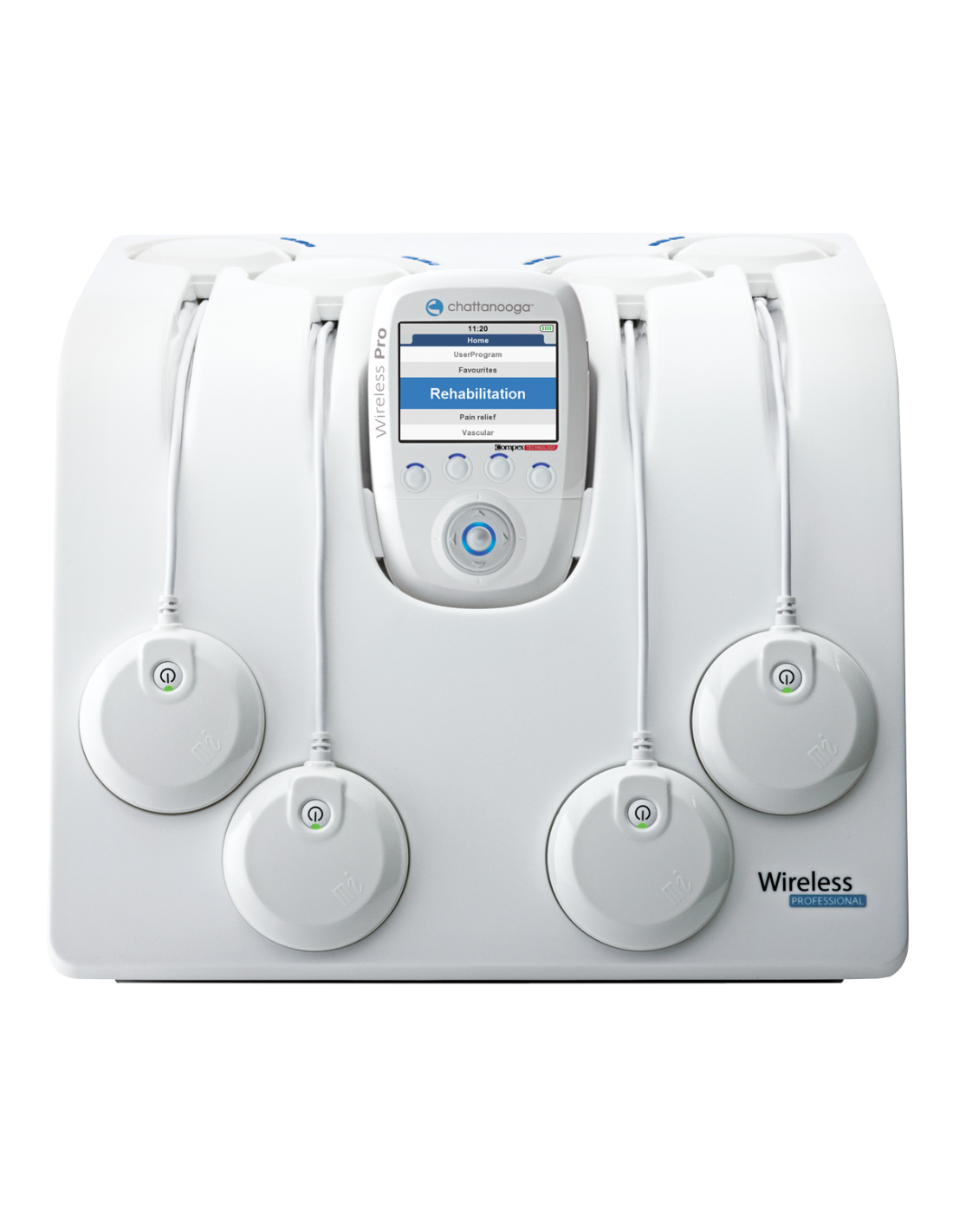 Le Wireless est livré avec 4 modules de stimulation, 2 télécommandes et une station de charge évoluée (SMART 4CH), l’appareil permet l’administration de plusieurs séances simultanément : Multi-Sessions.