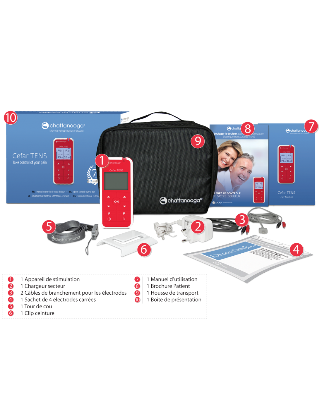 Le stimulateur est fourni avec un tour de cou détachable et un clip de ceinture qui facilitent son utilisation à domicile.